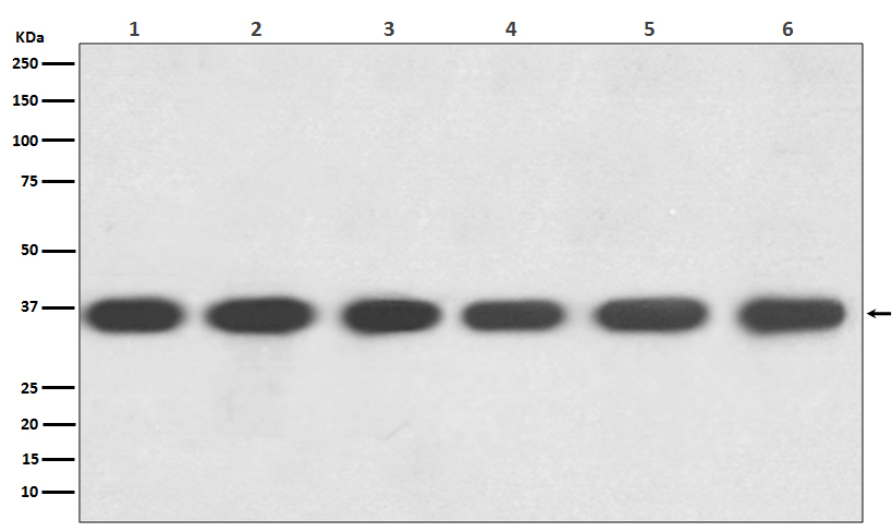 Western blot analysis of GAPDH expression in (1) Hela cell lysate; (2)Jurkat cell lysate; (3)Mouse kidney lysate; (4) Mouse spleen lysate; (5) RAW 264.7 cell lysate; (6) Rat brain lysate with GAPDH Antibody.