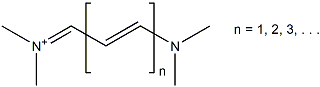 活花菁類染料(Cyanine Dyes)是一種在兩個氮原子間含聚亞甲基橋鍵且攜帶一非定域電荷的分子【見下圖】。